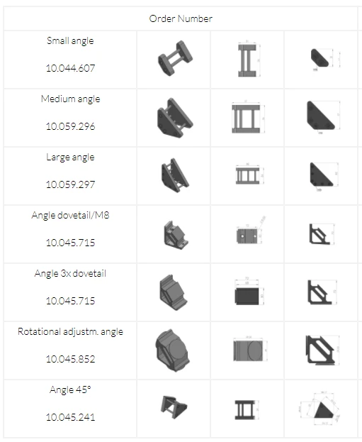 Angles are used to connect dovetail profiles and enclosures vertically or in a 45° angle. Angles are also used to build machine-frames or conveyor-belt bridges holding camera and laser enclosures.