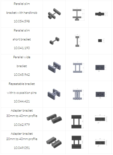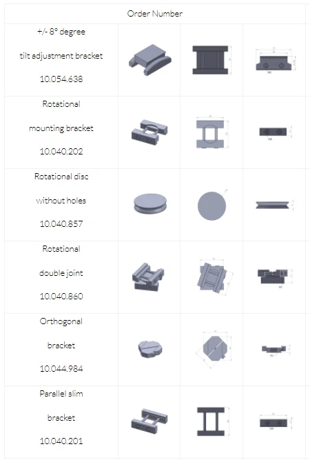Mounting brackets allow precise and vibration-proof mounting of dovetail enclosures to adapter-plates or to dovetail profiles. Combining several mounting brackets can meet any adjustment requirements of a camera system. The mounting kits show just a few possible mounting examples.